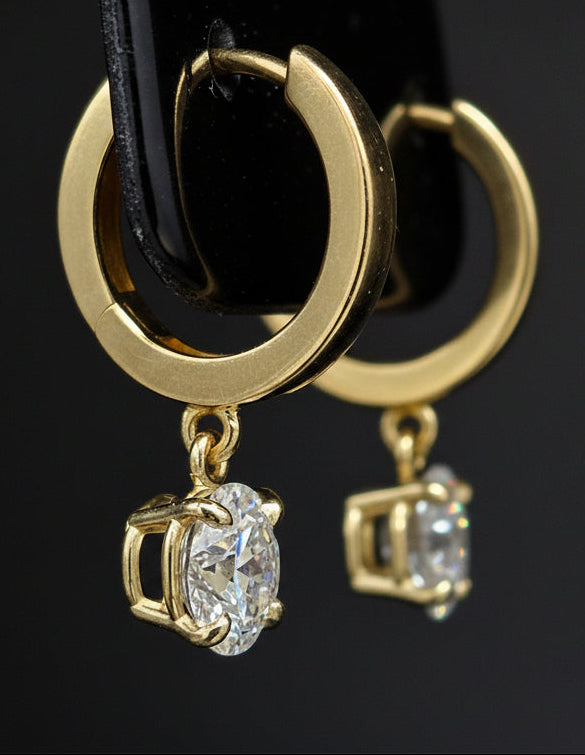 Two IGI E VS1 Lab-Grown Diamonds, one carat each, are set in 14k White or Yellow Gold baskets that hang from a hinged hoop. This is the 14.2mm hoop size, as pictured.